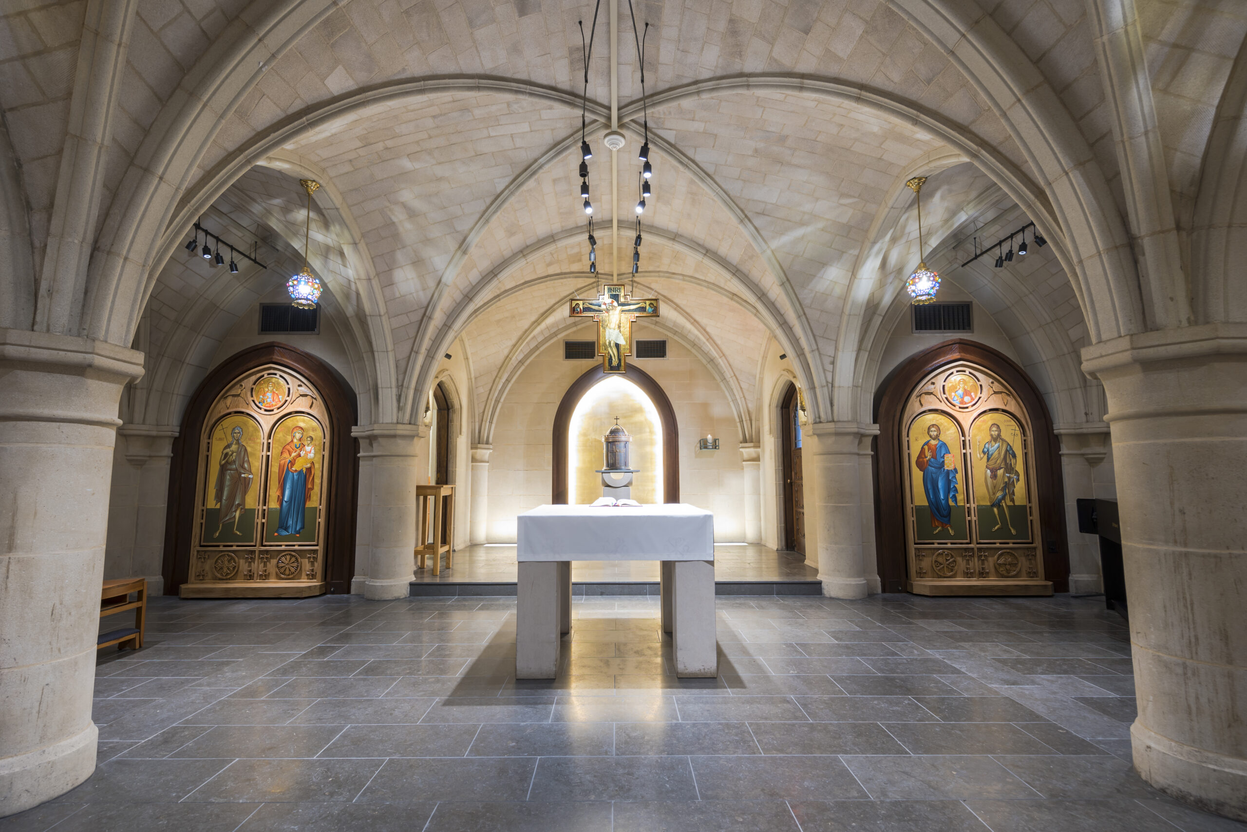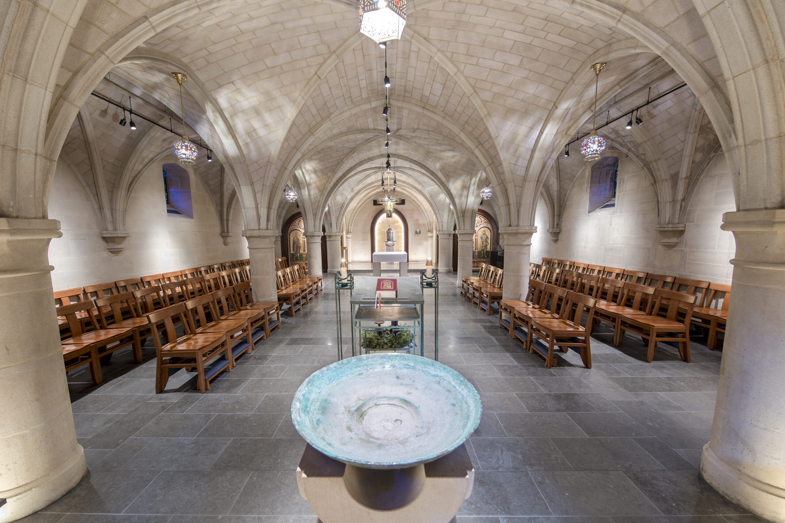 The project required meticulous coordination because both chapels are located in historic spaces with stone walls, intricate flooring, stained glass, and centuries-old finishes. Mueller designed new mechanical and electrical systems that seamlessly integrate into the existing fabric while remaining acoustically unobtrusive, maintaining an atmosphere suitable for prayer, meditation, and worship.