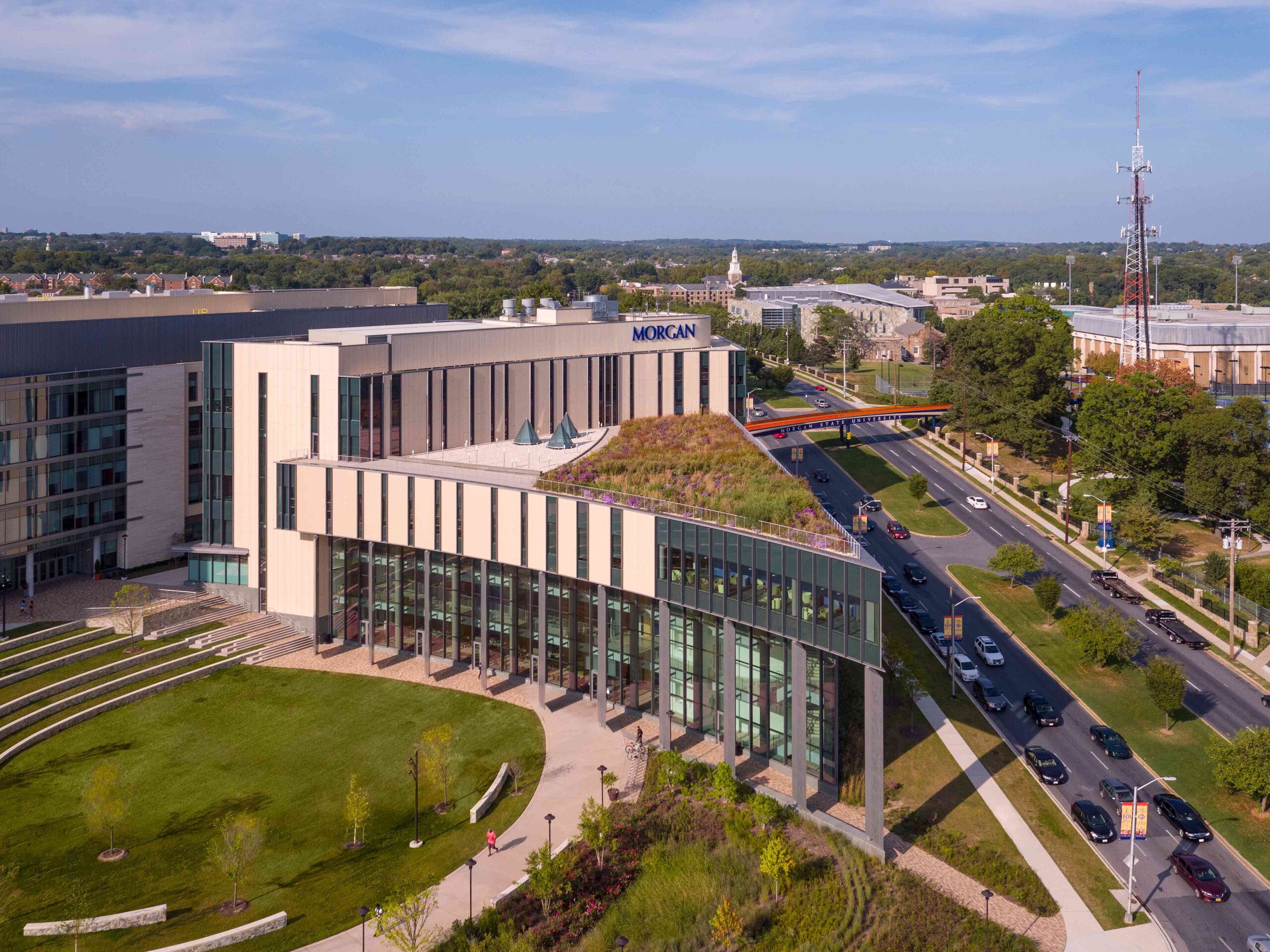 Situated on Morgan State’s emerging West Campus, the triangular building and its adjacent pedestrian bridge mark a prominent gateway along Hillen Road. Its sweeping curved façade embraces the circular West Quad, while a carefully curated palette of stone, masonry, and glass connects the building to the university’s architectural heritage.