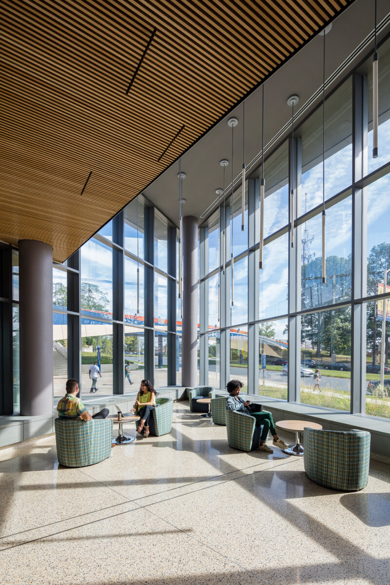 Sustainable design strategies—including a green roof, extensive daylighting, and architecturally significant “finned” exterior support columns angled to limit solar heat gain—help achieve an anticipated energy savings of 31%. These integrated systems support Morgan State’s sustainability goals and create a comfortable, efficient, and future-ready learning environment for students and faculty.